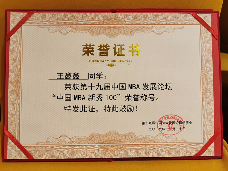 王鑫鑫同学荣获2019年“中国MBA新秀100”