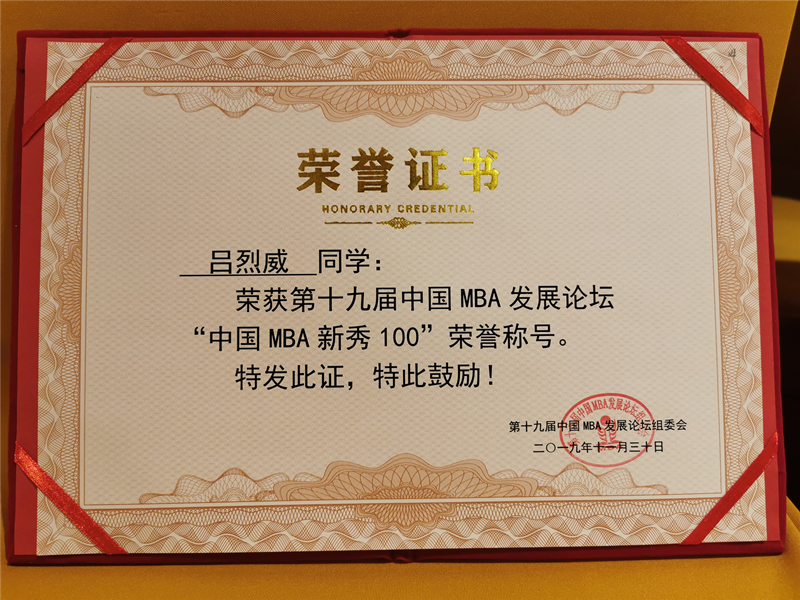 吕烈威同学荣获2019年“中国MBA新秀100”