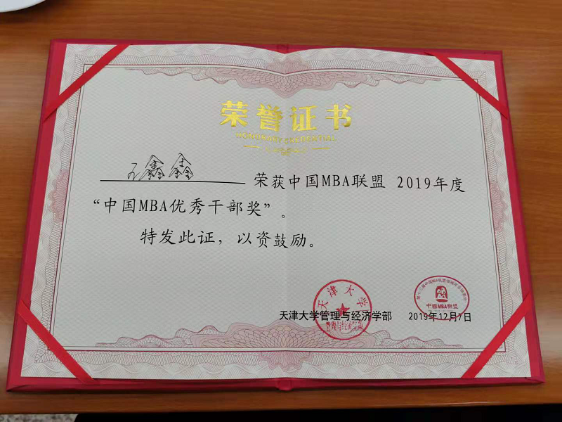 2018级MBA王鑫鑫获“2019中国MBA优秀干部奖”