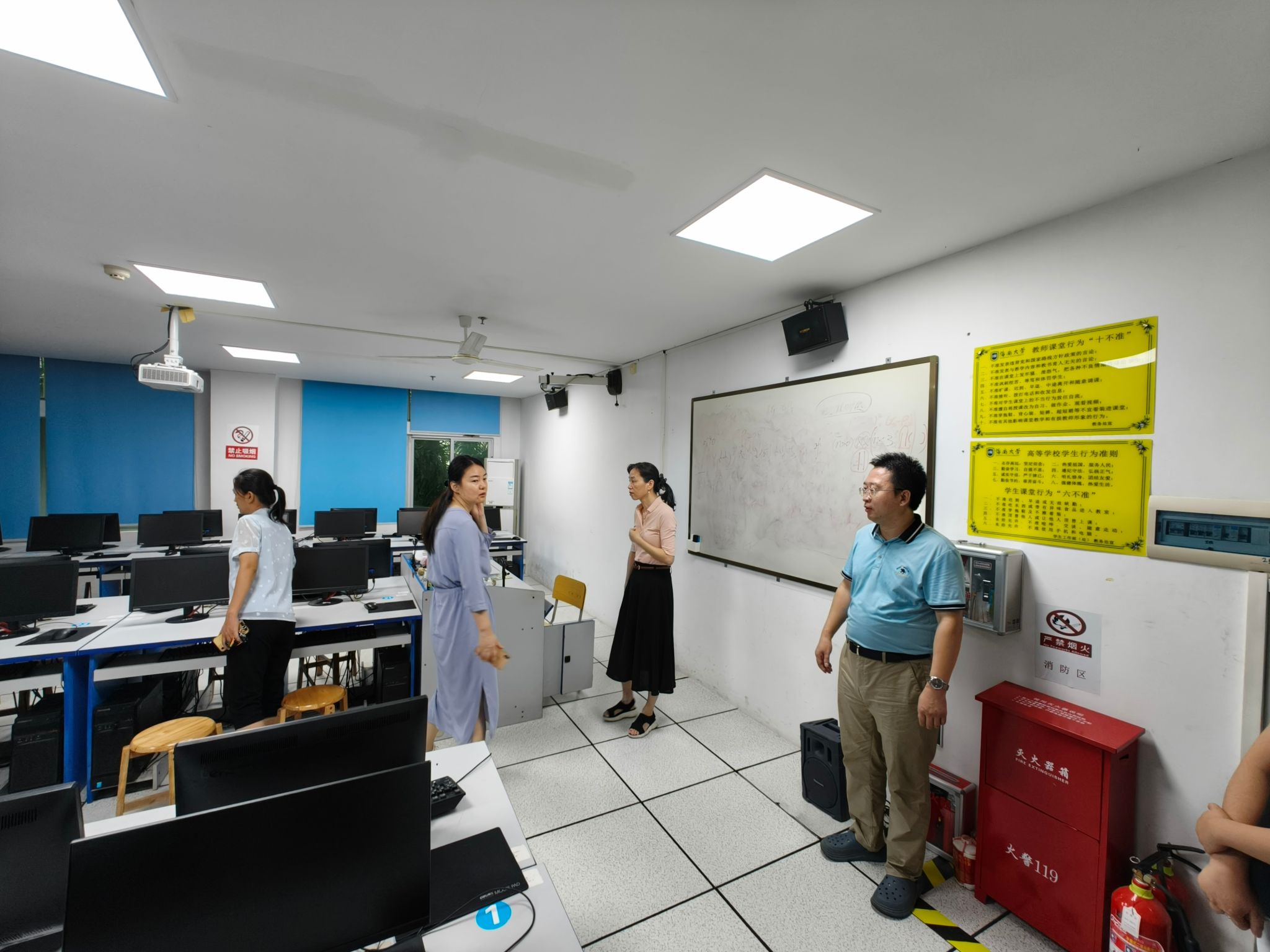为确保台风期间师生生命财产安全和校园稳定,经理唐宁玉带队全面排查公司防风设施、内涝点等重点部位风险隐患。2024年9月5日上午8:40,在唐宁玉的带领下,安全风险防控小组全面开展对各办公室、实验室、楼顶等部位的排查,重点检查实验室的用电安全、门窗有无破损,强调加固玻璃窗、清理高空坠物。同时,防控小组召开协调会议,社科楼楼宇各单位负责安全的老师参加会议,对防风防汛相关工作做了部署。