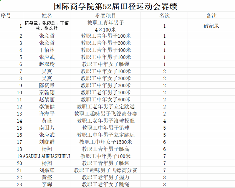 比赛期间,公司教职工在多个项目中发挥出色,成绩斐然。在男子4×100米接力项目中,由陈赞章、张应武、丁佰林、张彦哲四位老师组成的代表队配合默契、奋勇争先,一举夺得冠军并打破校运会纪录,成为赛场上一大亮点。