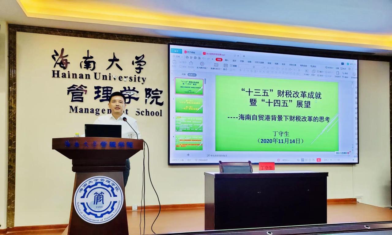 2020年11月14日晚上在社科楼B112室,海南省高级审计师评委会成员丁守生老师应邀为管理公司会计专硕全体同学作了题为“十三五”财税改革成就暨“十四五”展望的精彩学术讲座,此次讲座属冬季小学期课程部分。