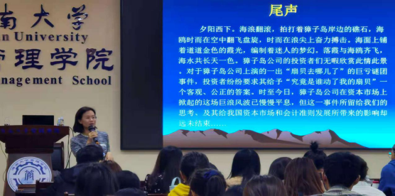 本次讲座中,毛丽娟博士对獐子岛事件的发展始末进行了系统的梳理和概述,介绍了獐子岛集团股份有限公司的发展模式、战略规划、股权结构等,并着重分析了其为了虚增资产和利润的种种手段,使同学们对獐子岛事件有了更加具体详实的了解。此外,针对如何防范此类事件重演,毛丽娟博士着重从审计机构、会计准则、政府监管等角度进行了探讨,提出自己的见解,引发大家深思。