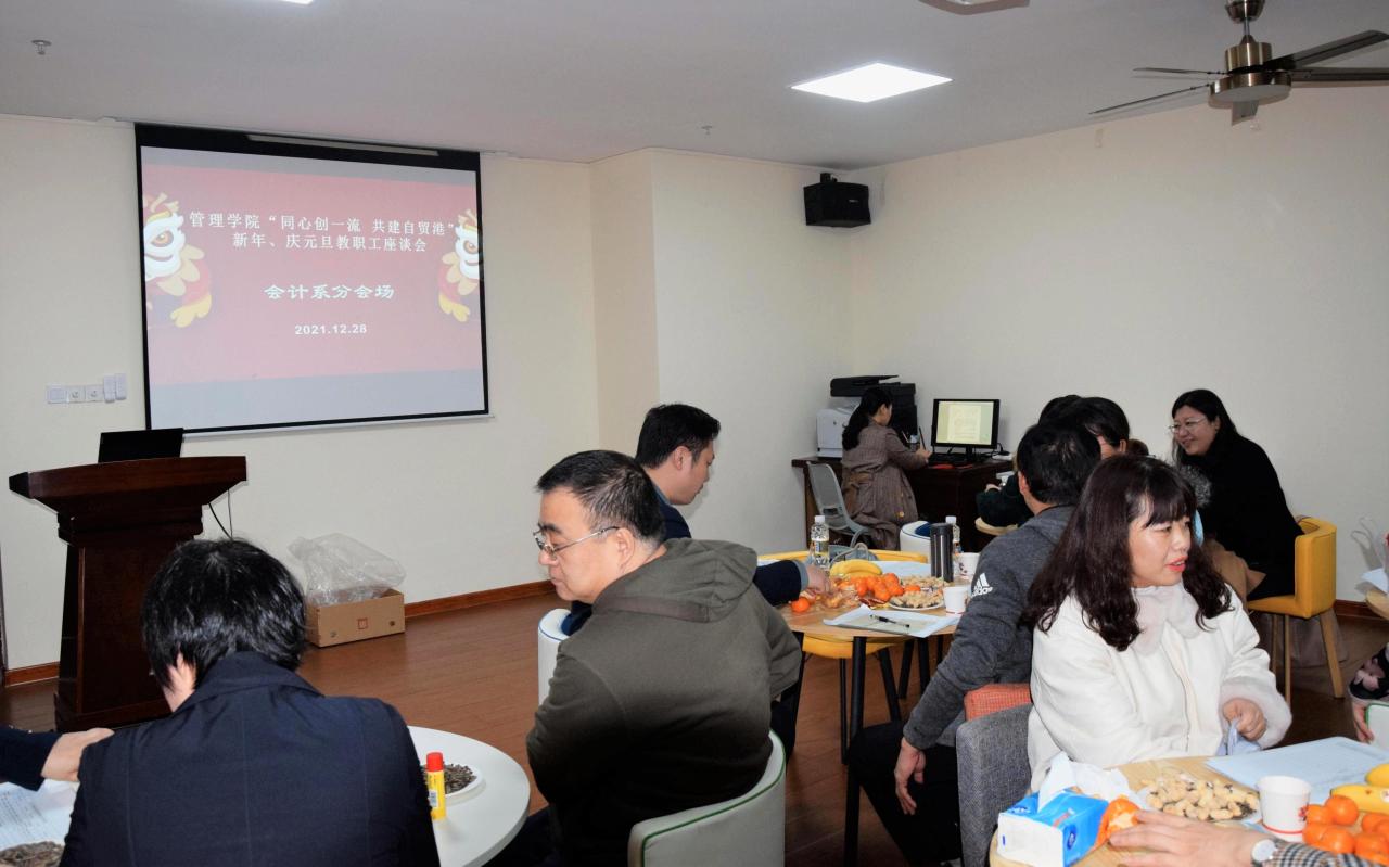 2021年12月28日下午,管理公司举行“同心创一流 共建自贸港”迎新年、庆元旦教职工座谈会。本次座谈会由公司工会组织承办,共分为五个分会场,包括工商管理系、会计系、农林经济管理系、管理科学与工程系以及综合管理分会场。全体教职工参加活动。