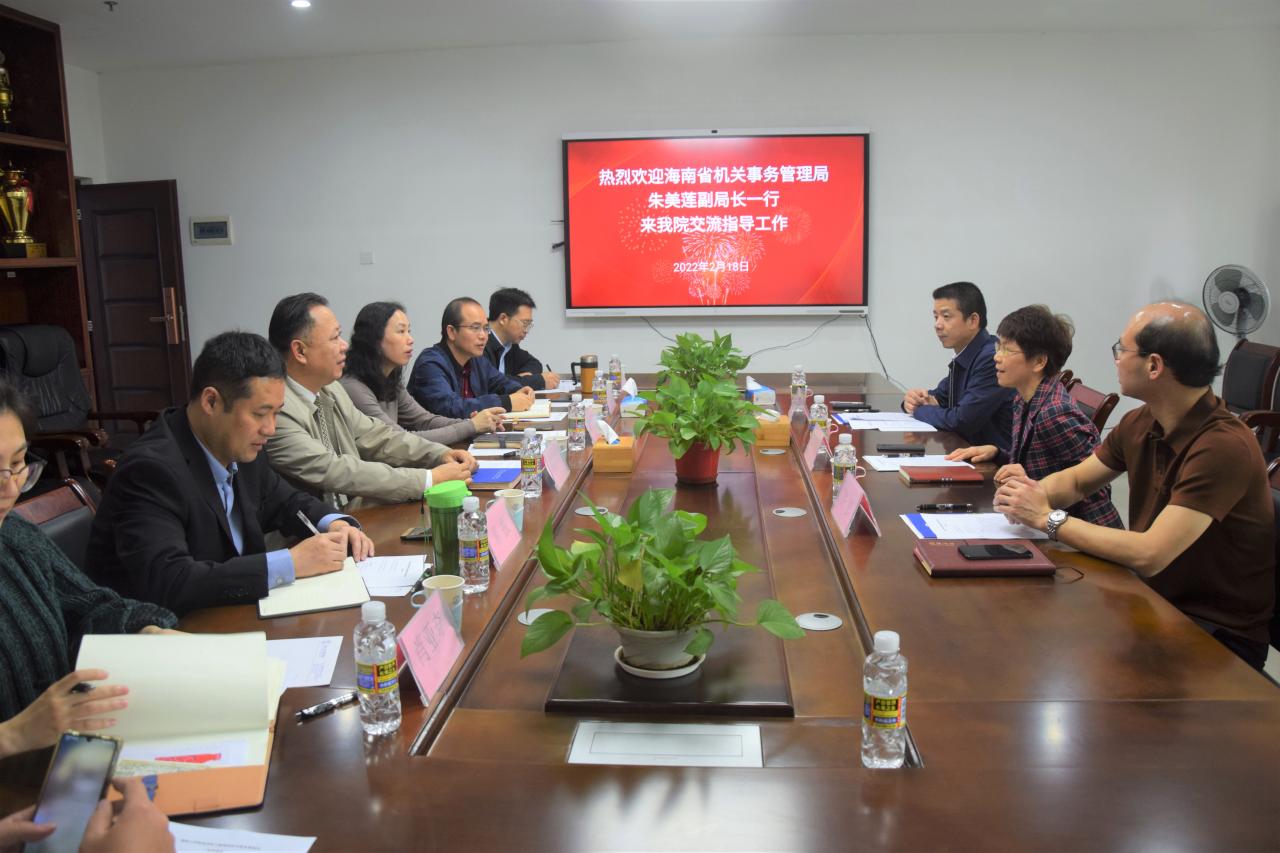2022年2月18日下午,海南省机关事务管理局朱美莲副局长、许彤处长、黄贵强主任一行来公司交流访问。bevictor1946韦德官网管理公司经理唐宁玉、党委书记邢谷川、副经理张德生、副书记易振、副经理付景涛、副经理童泽林及学工办主任肖亚奇、辅导员李春出席会议。