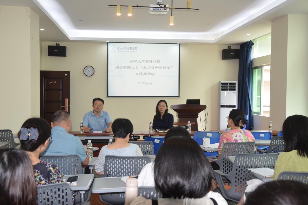 2022年7月6日上午,管理公司在社科楼B308室举行综合管理人员“能力提升建设年”大练兵活动。管理公司经理唐宁玉、副经理付景涛及全体综合管理人员参加活动。
