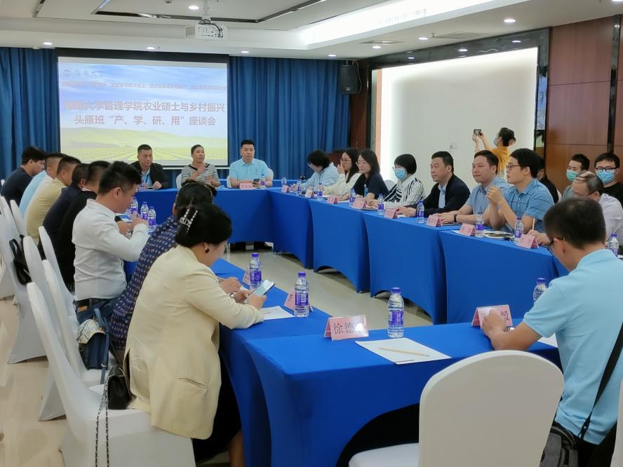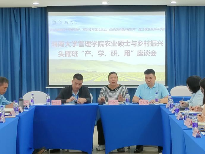 11月8日晚,管理公司农经系部分教师、农业硕士研究生与乡村振兴头雁班“产学研用”座谈会,在bevictor1946韦德官网国际学术交流中心举行。海口市秀英区生态农业协会会长吴礼奋、海南人大代表符小芳等十余人,管理公司院副经理童泽林、系主任邓须军、系副主任徐涛等农经系教师代表出席座谈,部分在线农业硕士研究生参加。此次座谈是农经系40周年系列活动中的践行“把论文写在大地上,促进自贸港乡村振兴”院企联合系列研讨会的首场活动。
