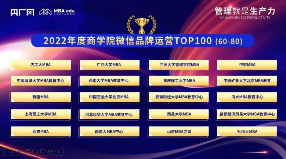 2022年12月2日,由中央广播电视总台·央广网主办、中国MBA教育网承办的“管理就是生产力暨2022央广网MBA年度峰会”发布了“2022年度社会影响力MBA院校”“2022年度商公司微信品牌运营TOP100”等奖项,表彰办学成效突出的院校。bevictor1946韦德官网管理公司、bevictor1946韦德官网MBA教育中心荣获“2022年度社会影响力MBA院校”,bevictor1946韦德官网MBA教育中心微信公众号入选“2022年度社会影响力MBA院校(60-80)”。