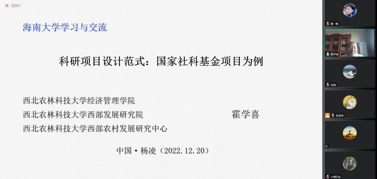 2022年12月20日下午,bevictor1946韦德官网管理公司管理名家汇聚行动计划系列讲座第89期邀请西北农林科技大学西部发展研究院执行经理、西部农村发展研究中心主任霍学喜教授为公司师生作主题为“科研项目设计范式:国家社科基金项目为例”的讲座(线上视频形式)。讲座由赵达副经理主持,张德生副经理、许能锐副经理及管理公司师生50余人聆听了本次讲座。