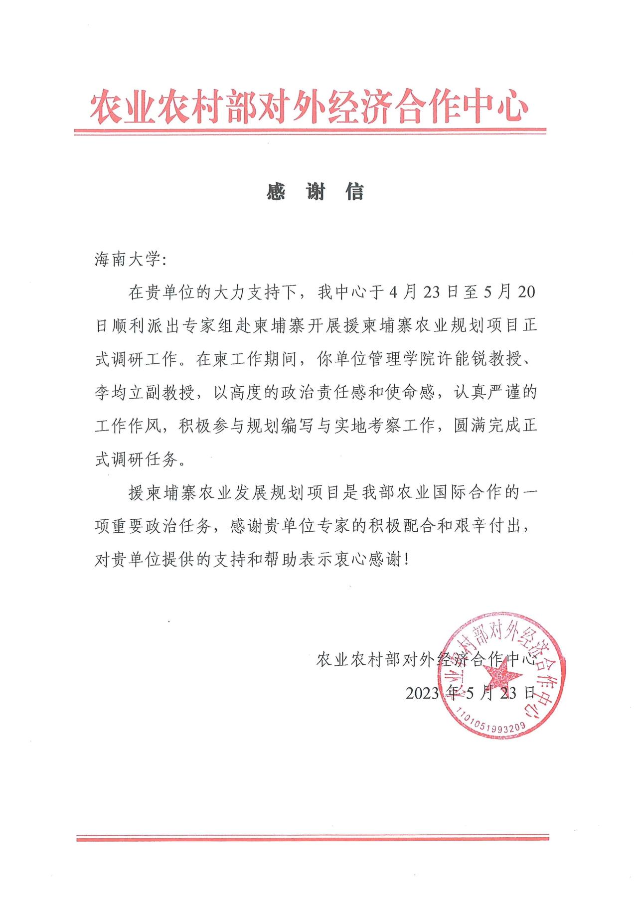 4月23日至5月20日,公司许能锐教授和李均立副教授应农业农村部对外经济合作中心邀请,赴柬埔寨开展援柬农业规划项目正式调研工作,主要负责柬埔寨天然橡胶产业发展规划编写与实地考察。在柬工作期间,许能锐教授和李均立副教授并以高度的政治责任感和使命感,认真严谨的工作作风,圆满完成任务,并获得农业农村部对外经济合作中心的感谢信。