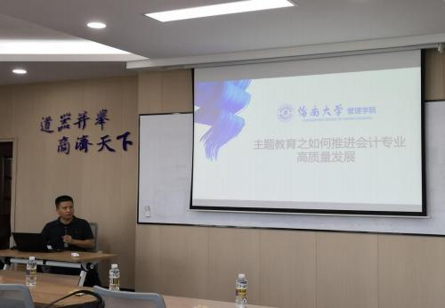 会议邀请副经理许能锐做《关于主题教育如何推进会计学科高质量发展》的专题报告。他以党建视角,从会计学科和专业发展的高质量、国际化人才培养目标定位;深化课程设置;加强实践基地建设;提高教师的专业素养和教学水平;紧密关注社会,特别是海南自贸港建设对高质量会计人才的需求的变化;与国外知名高校和专业机构开展合作,促进会计专业的国际化发展等方面分析了当前会计系具备的机遇与优势,面临的短板与挑战。