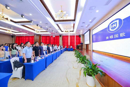 开学典礼在雄壮的国歌声中正式拉开序幕,参加开学典礼的师生全体起立,奏唱国歌。
