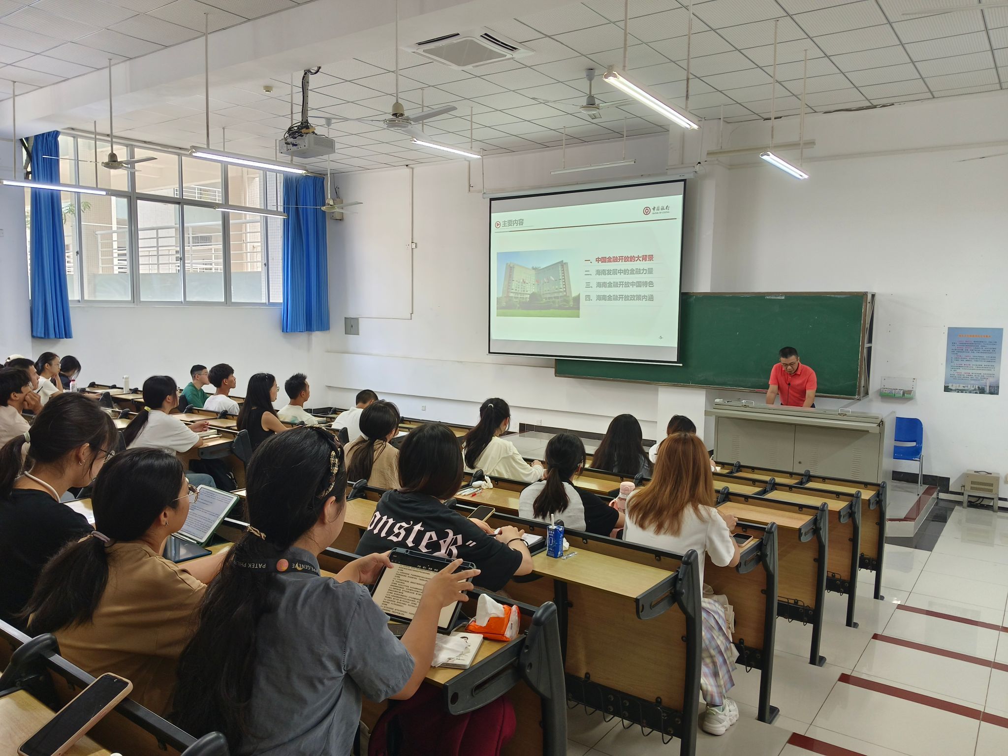 王方宏老师以当下海南自贸港政策为切入点,首先向同学们介绍了海南自由贸易港建设的背景和历史进程,然后分别从“中国金融开放的大背景”、“海南发展中的金融力量”、“海南金融开放中国特色”以及“海南金融开放政策内涵”这四个方面对海南自贸港金融开放的政策与前景做了详细的分析。最后介绍了2019年以来中国银行海南分行跨境业务的创新历程,以理论结合实际的形式让同学们对于自贸港金融开放有了更深层次的理解。