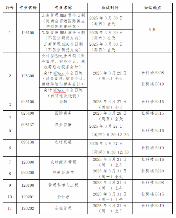 说明:1.以上招生计划和复试人数均不含专项计划。2.应用经济学、管理科学与工程、会计学、会计、会计( 自贸港反洗钱)等5个专业初试合格生源不足120%,按照公司相关规定,所有满足2025年相应学科国家线(B类考生)的考生都可参加复试。3.复试人数计算方法为:(招生计划人数-已录推免生人数)×复试比例。