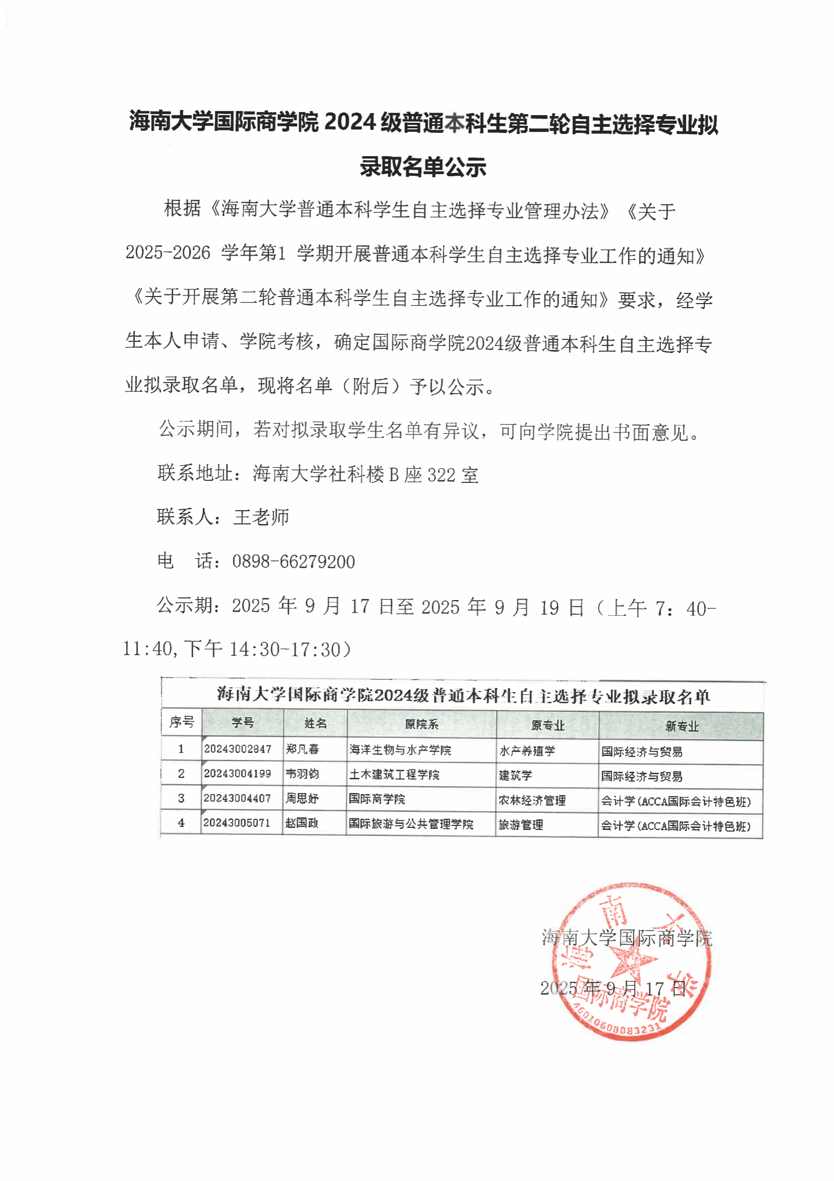 2024级普通本科生第二轮自主选择专业拟录取名单公示