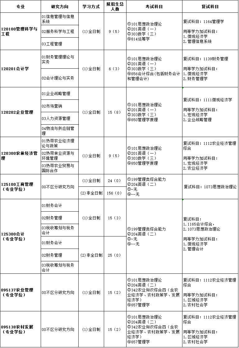 公司目前拥有工商管理一级学科博士学位授权点(研究方向包括:旅游管理、企业管理、财务管理、物流与供应链管理)及博士后科研流动站,工商管理、农林经济管理、管理科学与工程等3个一级学科硕士学位授权点。工商管理作为海南省唯一的经济管理类博士点,系海南省特色重点学科,在2016年的教育部第四轮学科被评估为B级。农林经济管理为海南省重点学科。公司还拥有工商管理硕士(MBA)、会计硕士(MPAcc)以及农业硕士(农村发展和农业管理方向)3个专业学位硕士授权点。