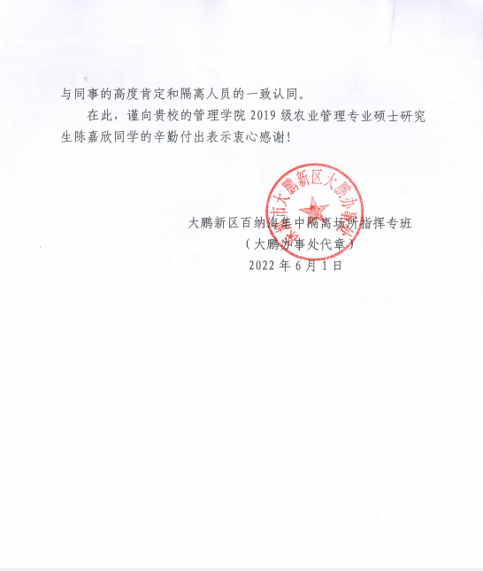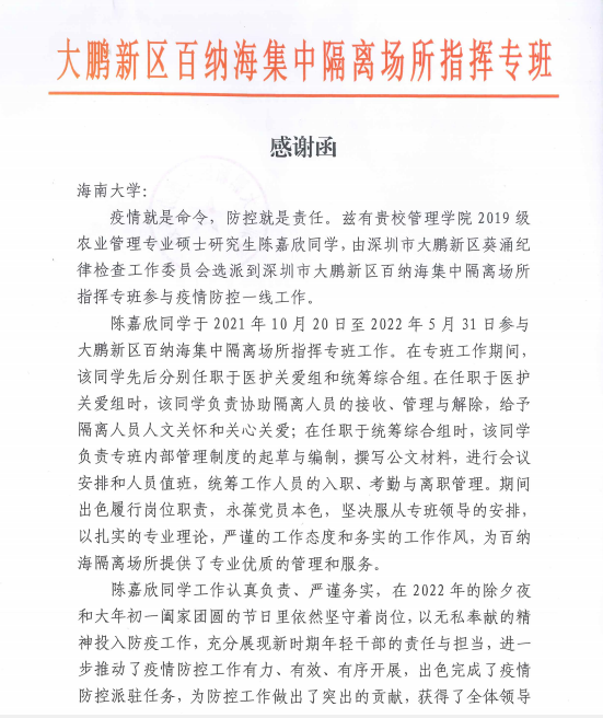 深圳市大鹏新区百纳海隔离场所指挥专班感谢函
