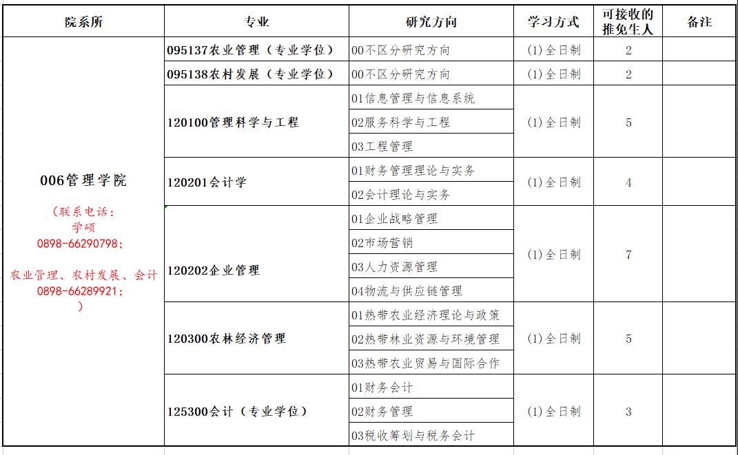 (1)申请专业为企业管理、会计学、农林经济管理、管理科学与工程的考生,请将申请材料发送至glxyxkb@hainanu.edu.cn,联系电话:0898-66290798,联系人:易老师。