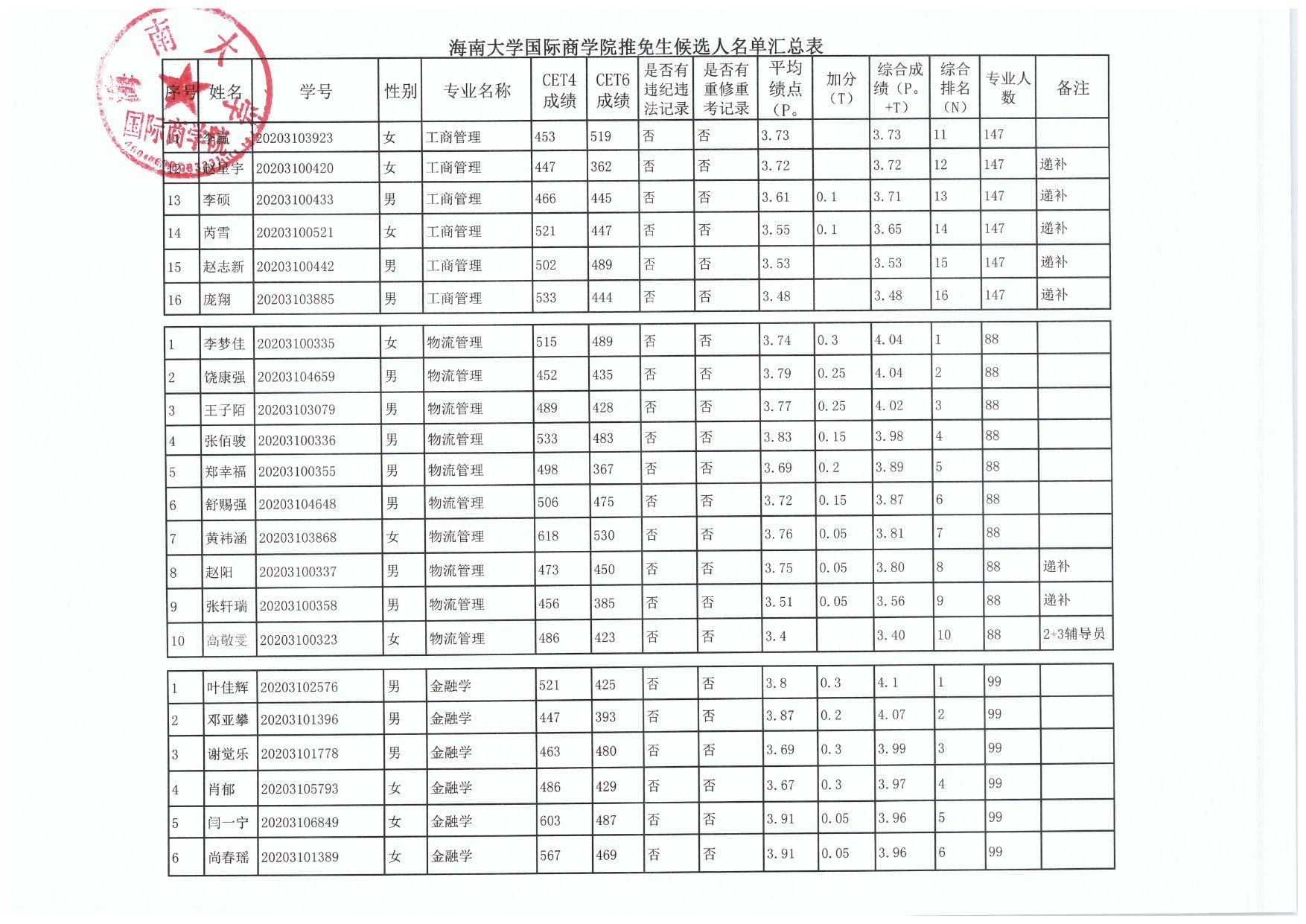 本科生名录