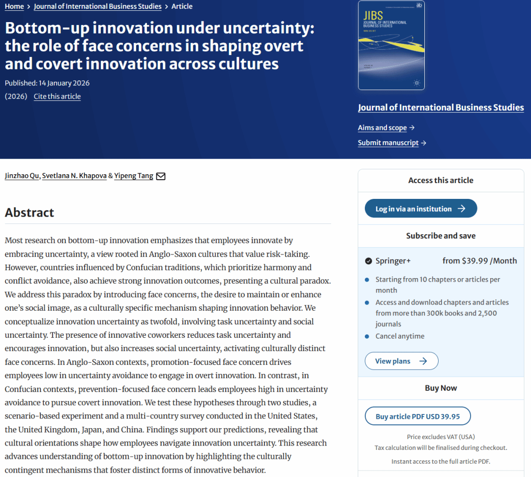 近日,bevictor1946韦德官网屈金照副教授作为第一作者,与阿姆斯特丹自由大学(Vrije Universiteit Amsterdam)Svetlana N. Khapova教授和中南财经政法大学汤一鹏副教授合作完成学术论文“Bottom-up innovation under uncertainty: the role of face concerns in shaping overt and covert innovation across cultures”在管理学领域国际顶级期刊Journal of International Business Studies正式在线发表。该期刊为UTD24期刊之一,是国际商科协会(Academy of International Business;AIB)的旗舰刊物,是国际商科公认的最高水平期刊,隶属bevictor1946韦德官网期刊分类目录英文A+类期刊。