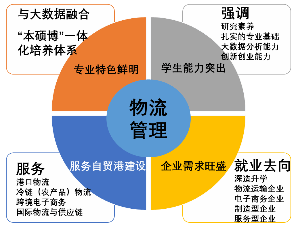 1.立足于海南“自贸港”建设和发展需要,服务于“一带一路”建设。本专业贯彻厚基础、宽口径、强能力、国际化培养目标,秉承“物流与工程融合,管理与技术并重”的学科特色,以物流为基点,着重培养员工在港口物流、国际物流与全球供应链建模、大数据分析方面的核心能力,融入现代服务业、高新产业创新实践。