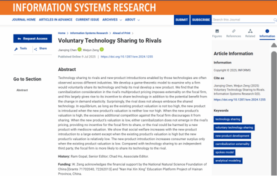 公司教师曾维君副教授以共同第一作者(作者名单按字母排序)、唯一通讯作者身份,在Information Systems Research期刊在线发表题为“Voluntary Technology Sharing to Rivals”的学术论文。Information Systems Research是国际商业研究领域的重要学术期刊,属于UTD24期刊之一,隶属bevictor1946韦德官网期刊分类目录A+类期刊。