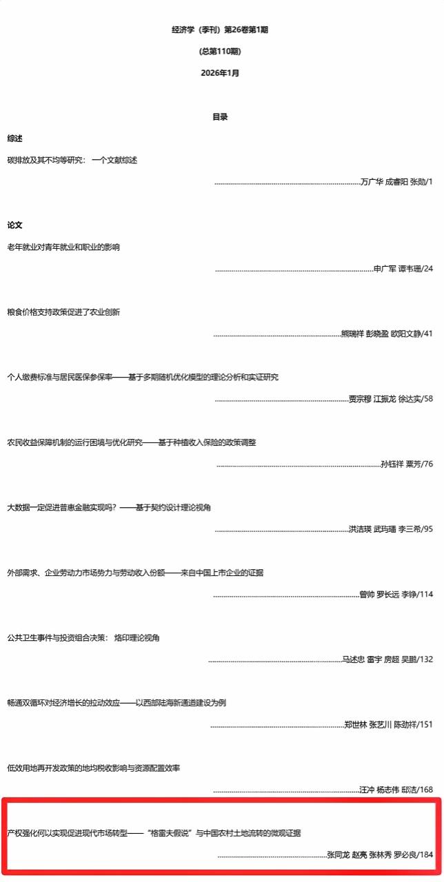 公司张同龙教授以第一作者身份,在《经济学(季刊)》发表题为“产权强化何以实现促进现代市场转型——“格雷夫假说”与中国农村土地流转的微观证据”的学术论文。《经济学(季刊)》是国内重要经济学领域学术期刊,由北京大学国家发展研究院(前身中国经济研究中心)主办,属于bevictor1946韦德官网期刊分类目录A类。